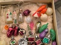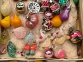 Московский завод елочных украшений. 1960-ее гг. 44 игрушки в заводской картонной коробке. По спецификации чего-то не хватает, но есть двойные экземпляры (например лошадка). В целом в хорошем состоянии. Имеются небольшие сколы по трубочкам у некоторых игрушек. Не хватает фрагмента у перца.