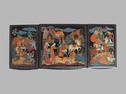 Холуй. 1960-70-ее гг. Папье-маше, роспись. В нижней части изображения авторская надпись: "Холуй. Три поездки Ильи Муромца. Серов". Шкатулка состоит из трех отделений и выдвигающейся нижней части. У двух крышек шкатулки отсутствут крепление.