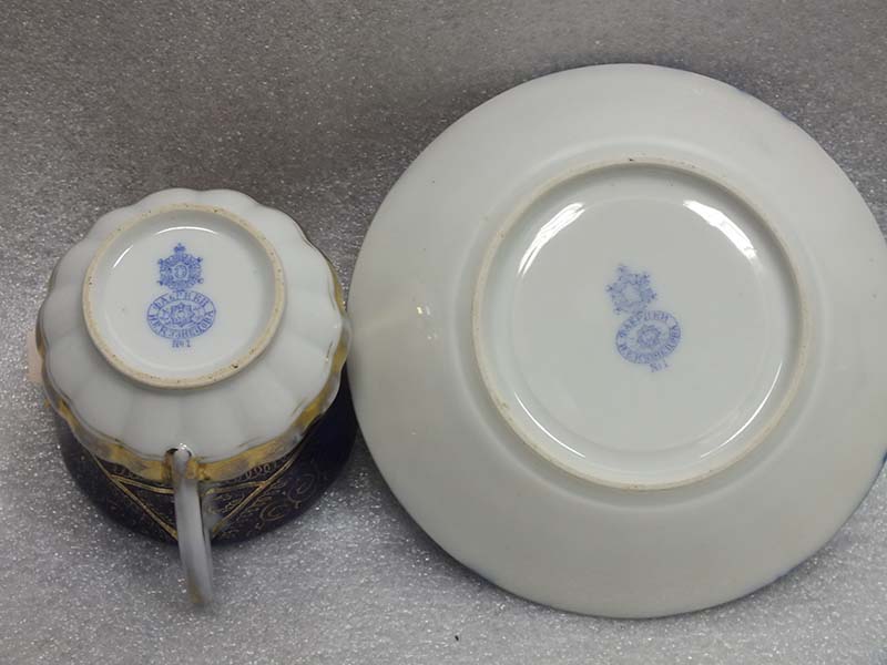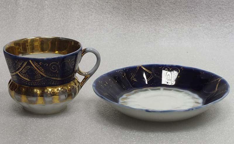 Россия. Фабрика Т-ва М.С. Кузнецова. Нач. ХХ века. Фарфор, крытье синей краской, роспись золотом. Имеется небольшая трещинка паутинка на чашке. Небольшие потертости золочения.