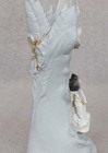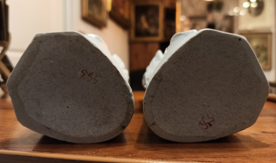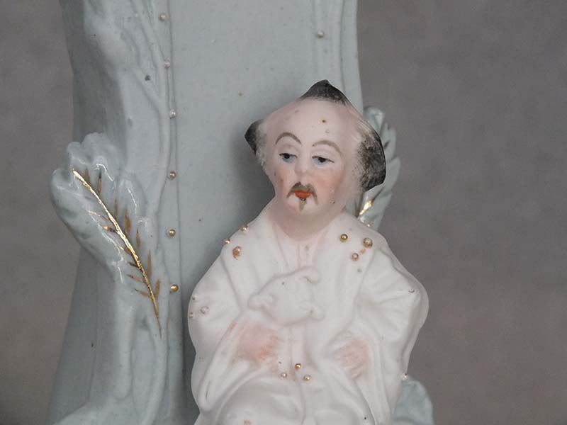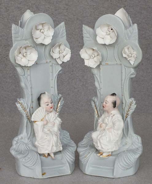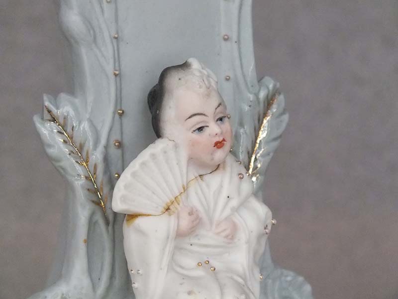 Предположительно Германия. Нач. ХХ века. Фарфор, подкрашивание, лепка. Ваза, которую украшает скульптурное изображение женщины в кимоно с веером, имеет достаточно большой отколотый фрагмен, приклеенный обратно (следы клея). Т.ж. приклеена голова с веером. Имеются сколы лепестков на одном из цветов. Ваза с мужчиной - целая, за исключением скола лепестков на одном из цветов и потери незначительных краев лепстков - на оставшихся цветах.