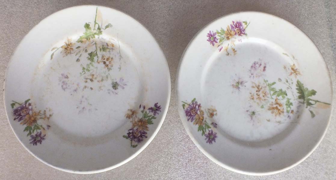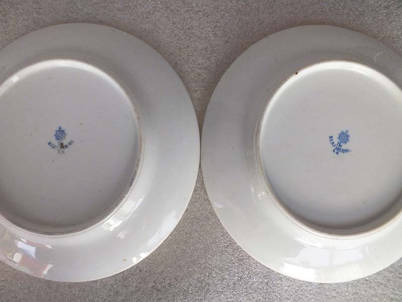 Россия. Фабрика Т-ва В.Ф. Кузнецова. Кон. XIX - нач. ХХ века. Синяя надглазурная марка. Фарфор, деколь. Рисунок практически стерт. Потертости эмали, многочисленные щербинки. Тяжелые. Цена за пару.