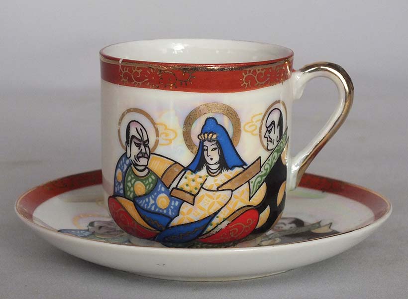Япония. 1950-ее гг. Фарфор, роспись, накат краски, перламутр. Сквозная трещина по чашке. Небольшая трещина на блюдце. На дне чашки литофания с портретом гейши. Обязательно посмотрите дно чашки на просвет!