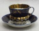 Россия. Фабрика Т-ва М.С. Кузнецова. Нач. ХХ века. Фарфор, крытье синей краской, роспись золотом. Имеется небольшая трещинка паутинка на чашке. Небольшие потертости золочения.