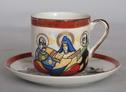 Япония. 1950-ее гг. Фарфор, роспись, накат краски, перламутр. Сквозная трещина по чашке. Небольшая трещина на блюдце. На дне чашки литофания с портретом гейши. Обязательно посмотрите дно чашки на просвет!