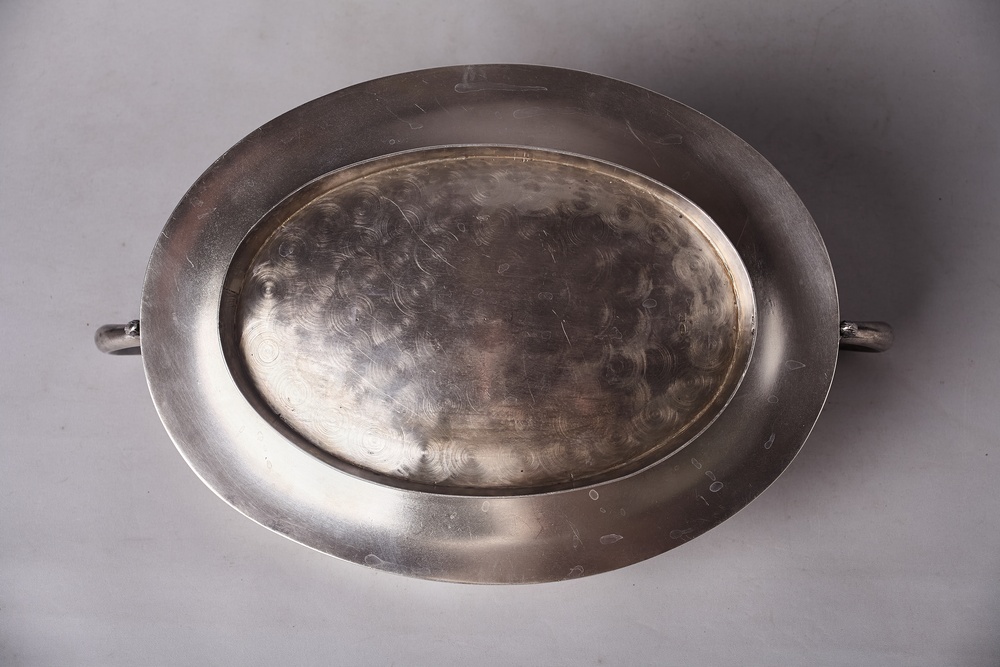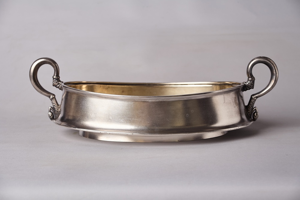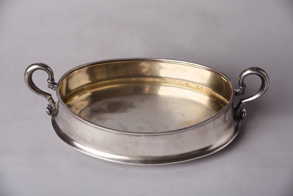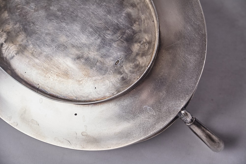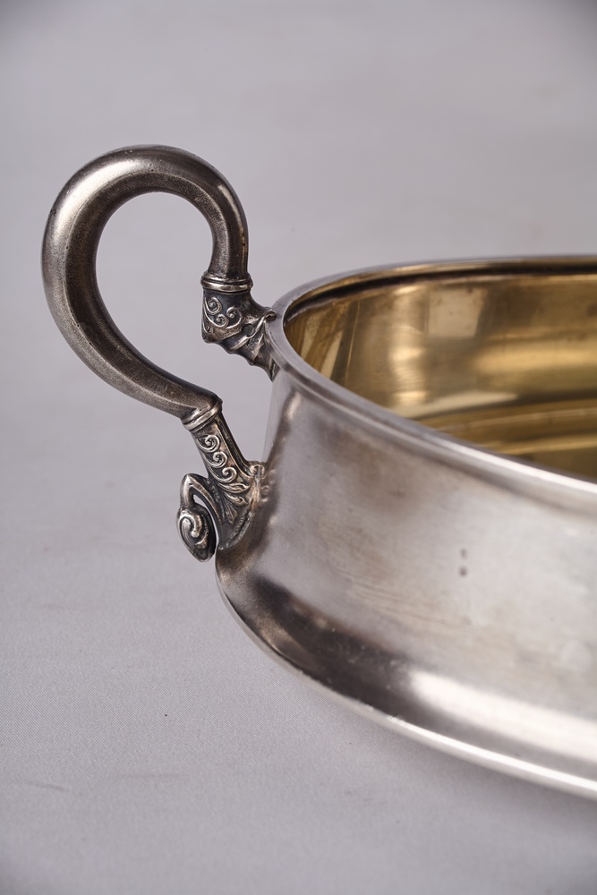 Россия. До 1917 года. Серебро 84 пробы, гравировка, остатки золочения. Клеймо "84" с женской головкой в кокошнике, повернутой в левую сторону. Клеймо пробирного мастера "ВА". Пробы проставлены на всех отдельных деталях предмета. Вес - 659 гр. Основание немного неровно. Несколько темных незначительных точек по серебру