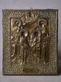 Россия. Нач. ХХ века. Доска; лики, руки святых - подокладная живопись с дефектами. Сохранены частично 4 лика из семи. Оклад - латунь, чеканка. Край - достаточно тонко сделанный растительный орнамент.