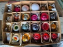 СССР.  (что то Германия) 1970-ее гг. Стекло. Имеются потертости краски. Имеются незначительные сколы по трубочкам под навесами. В основном шары. Одна пирамидка (скол по трубочке). Из всех игрушек два шара - современные китайские. Стоимость комплекта - 1.200 руб. Коробка в очень плохом состоянии.